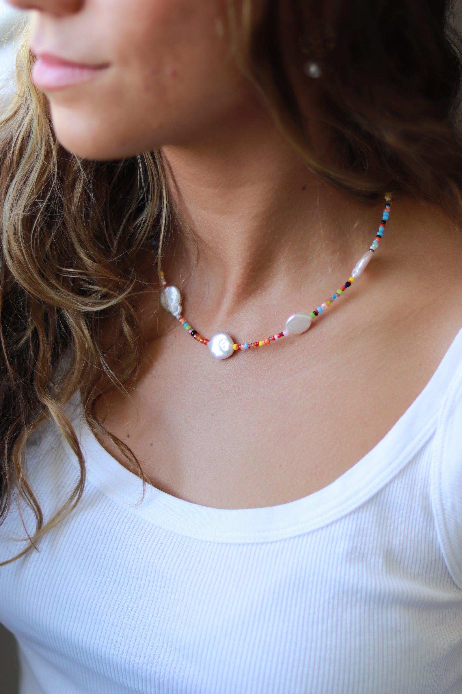 An everyday piece that is handcrafted with a colourful mix of tiny gemstones and glass with a freshwater pearl section to the side. Finished with a Sterling Silver clasp and chain.