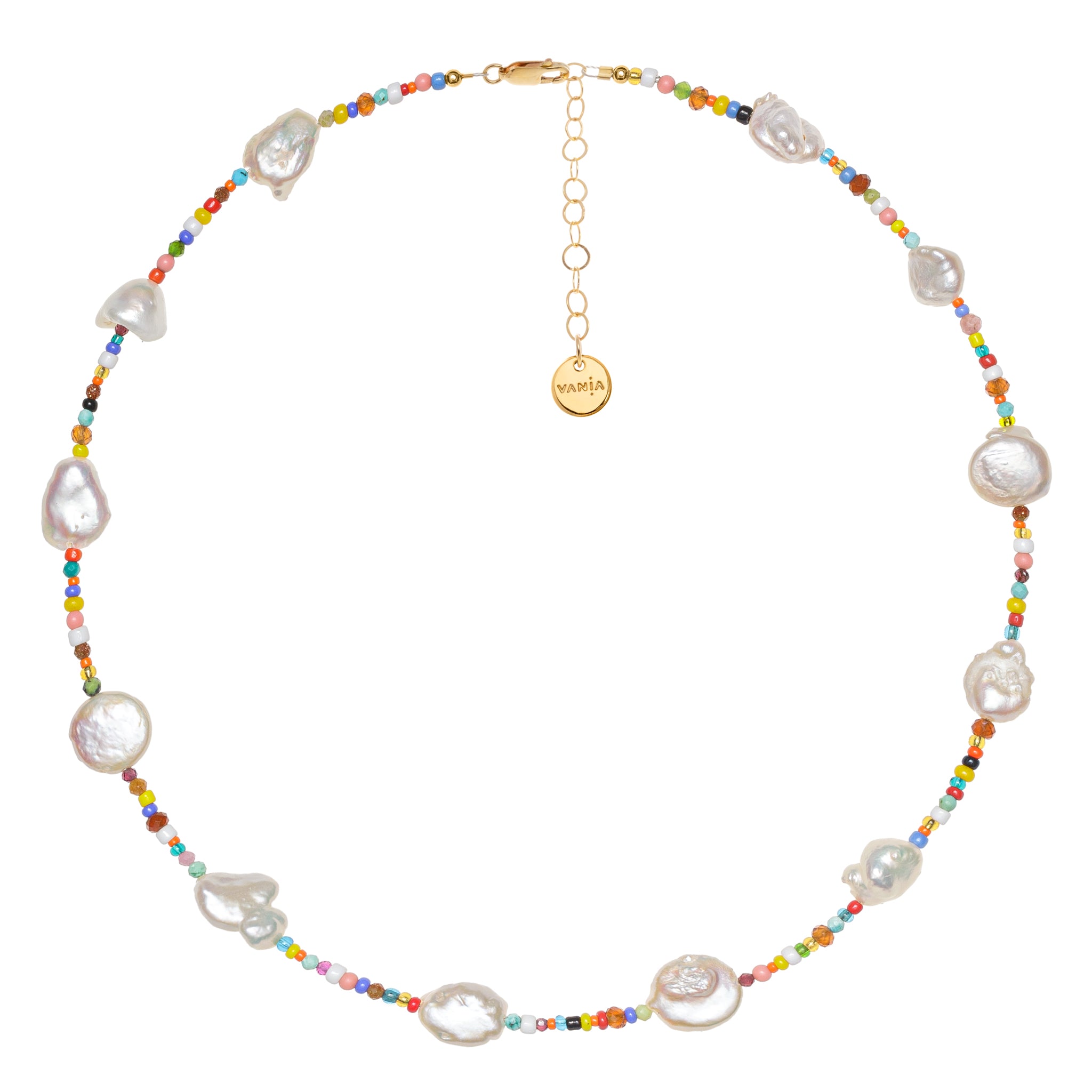 Handmade with Baroque freshwater pearls that are spaced out by our joyful mix of glass and gemstones. Finished with 14ct gold-filled beads and clasp.