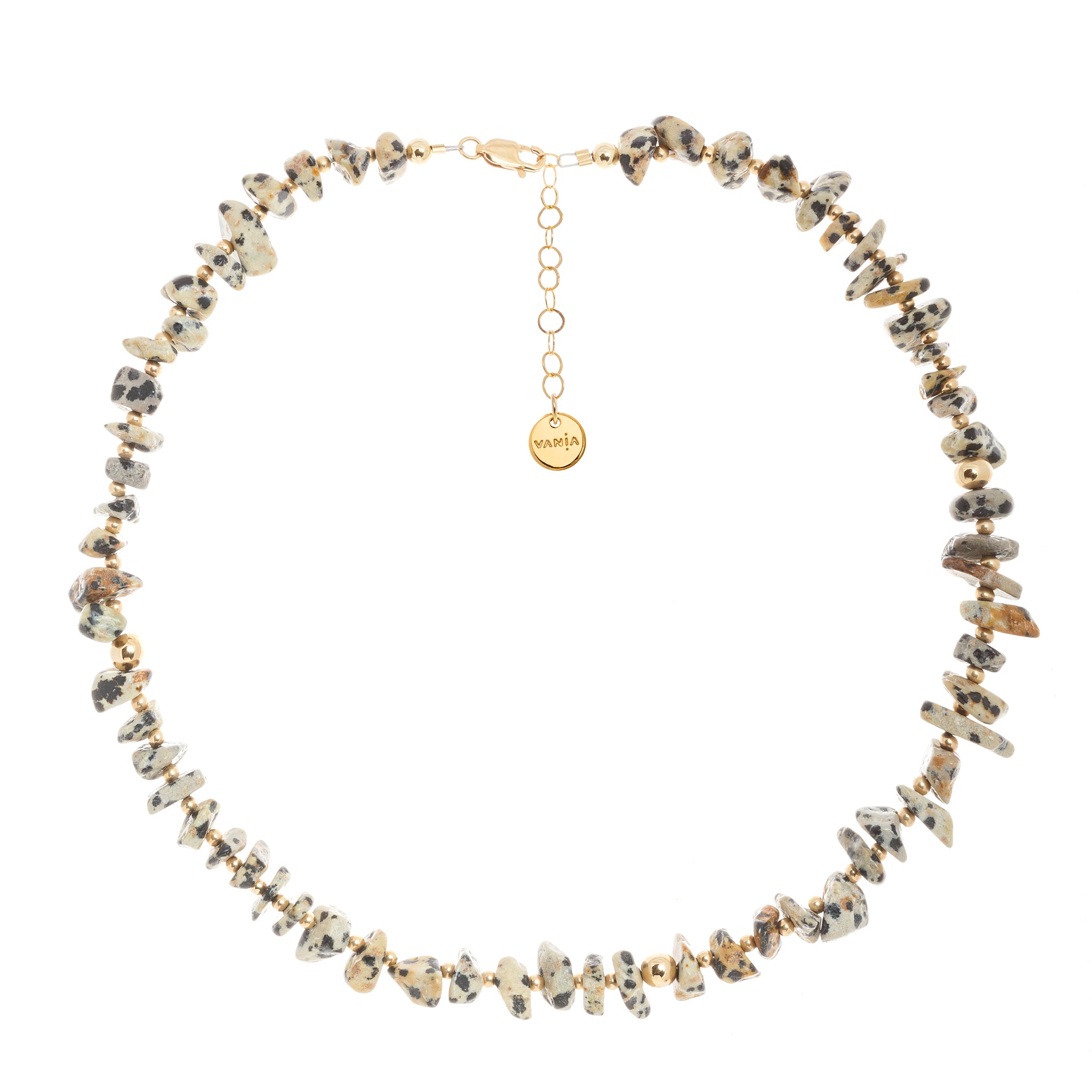 The Amuleto Dalmatian Jasper Choker is crafted with Dalmatian Jasper chip and elevated with 14karat gold-filled beads. Each bead is threaded by hand individually with lots of patience, love & happy thoughts resulting in a piece that truly shines.