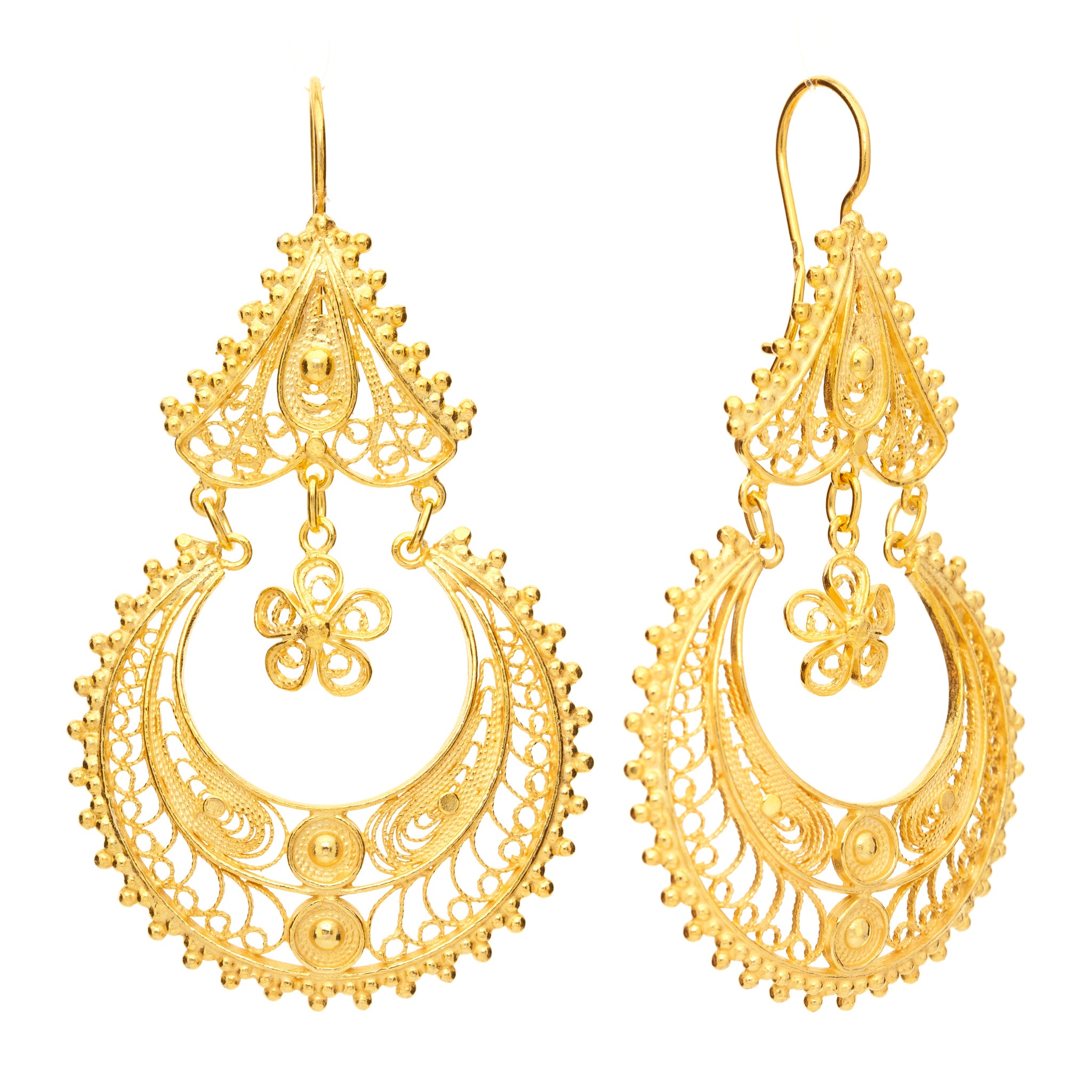 The cascading floral motif and delicate crescent hoops create a stunning blend of movement and artistry. These earrings are a true invitation to embrace heritage, sophistication, and your inner queen.