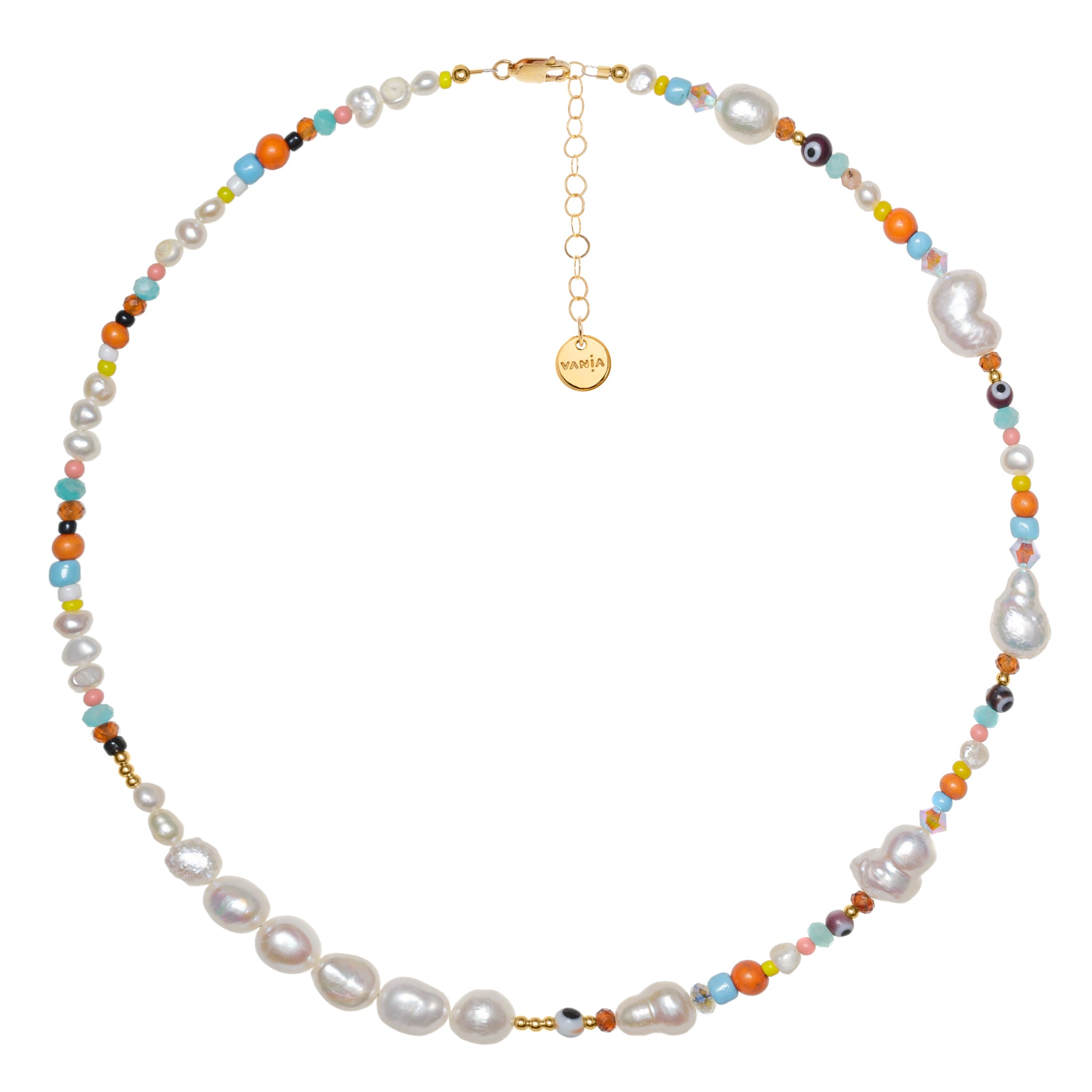 This unique and colourful number is handcrafted with freshwater pearls, Swarovski crystals, evil eyes and glass beads. Finished with 14ct Gold-filled beads and clasp.