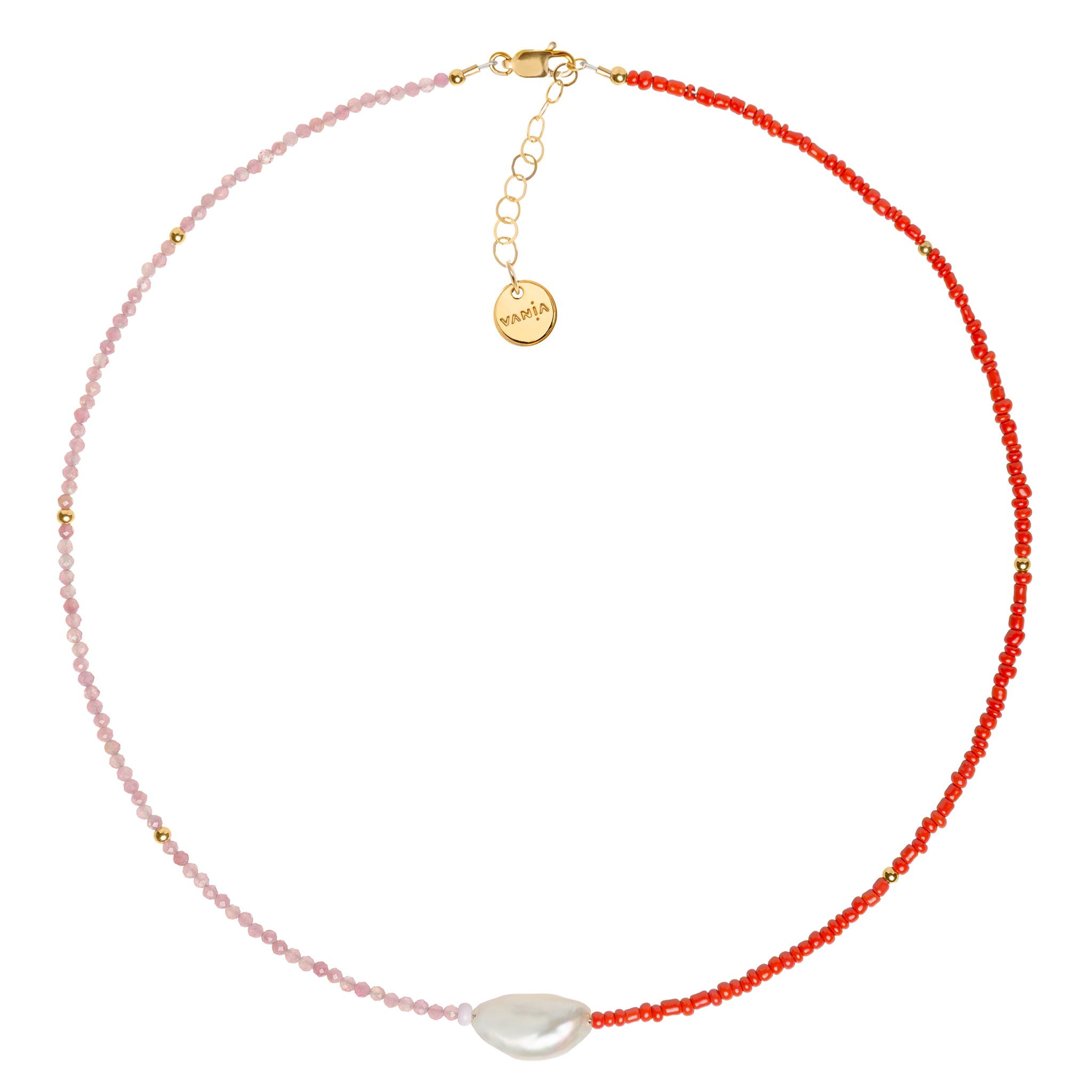 Bold yet perfectly balanced, this necklace is handcrafted with a playful mix of fiery red and soft pink beads, finished with a luminous freshwater pearl as its centrepiece. Equal parts sweet and daring, it’s that perfect reminder that FUN really is your middle name.