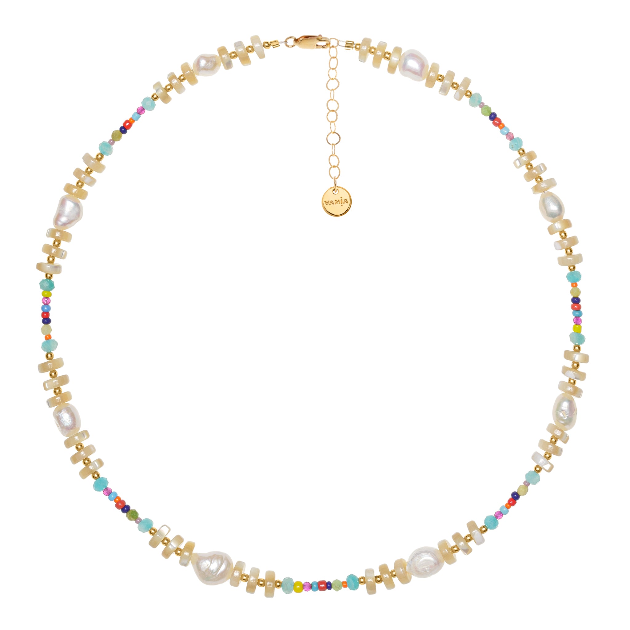 It's FUN O'clock you know what that means! This one of a kind necklace is handcrafted with mother or pearl, freshwater pearls, amazonite and tiny glass beads. Finished with 14ct gold-filled beads and clasp.