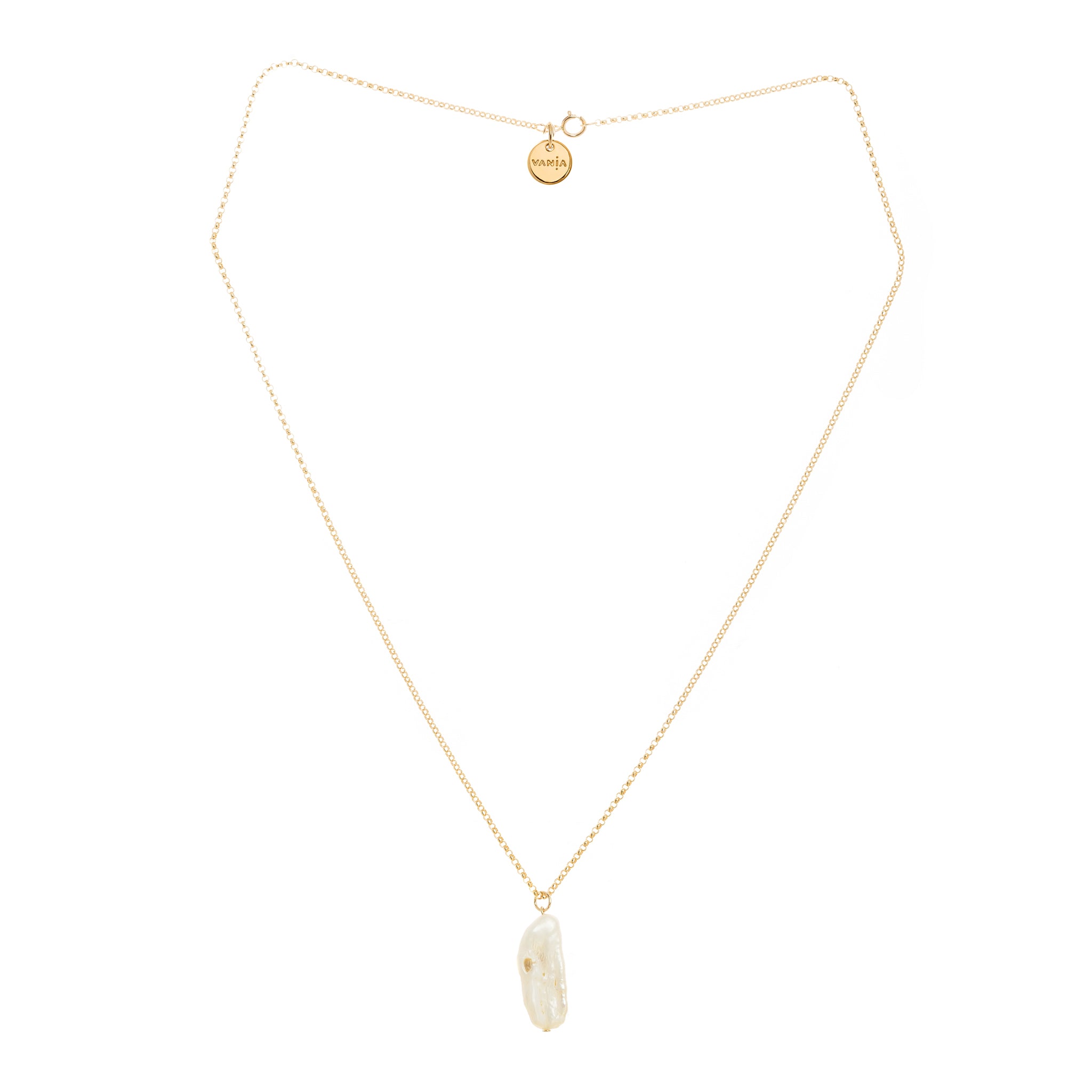 Crafted with 14ct Gold-filled classic rolo chain. This fine chain necklace features a Baroque Freshwater pearl as a pendant and measures 45cm long. It sits a short necklace on your décolletage.