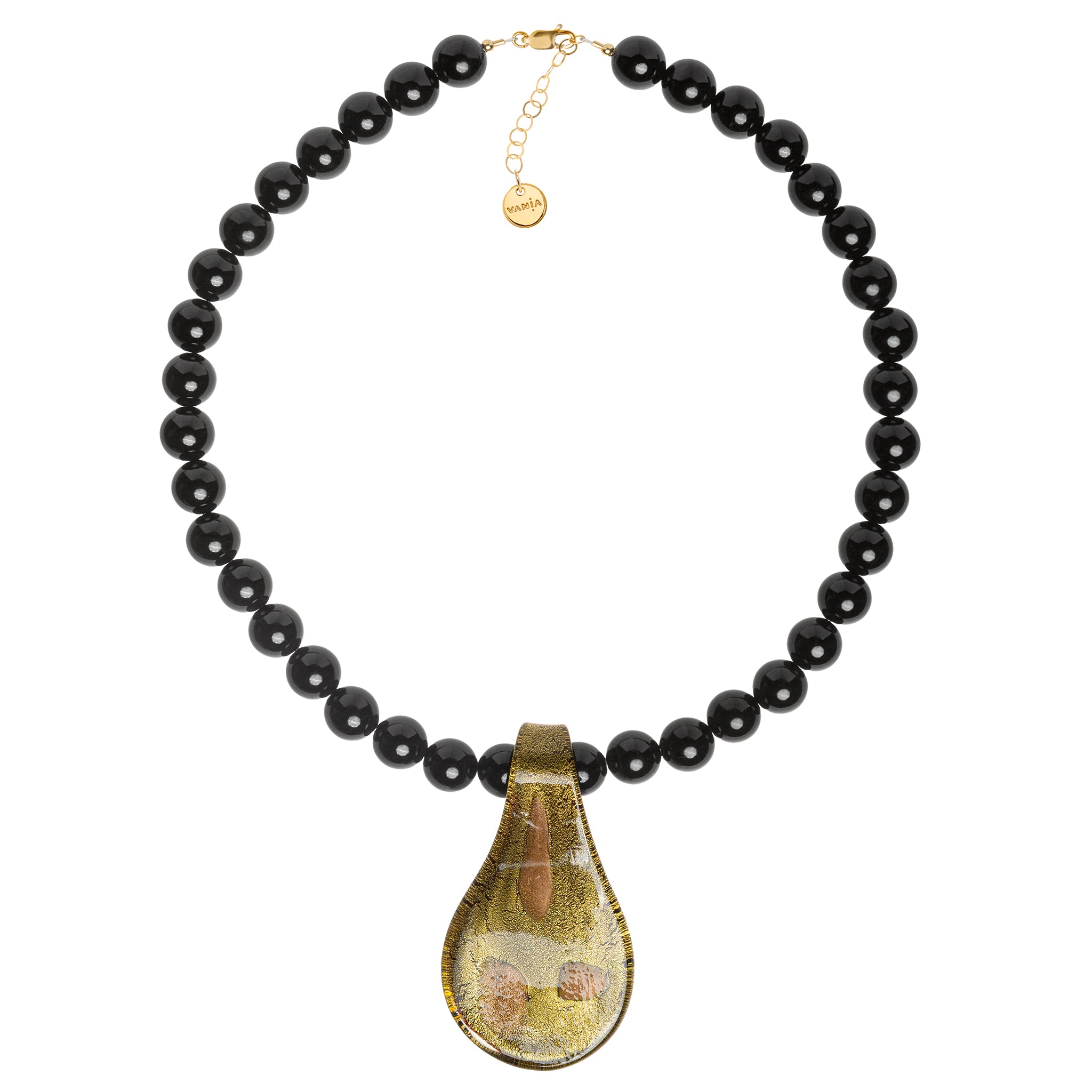 Bold and elegant, this necklace is handcrafted with glossy black onyx beads. At its centre rests a striking handmade glass pendant swirled with tones of gold and bronze—a playful balance of sophistication and fun.