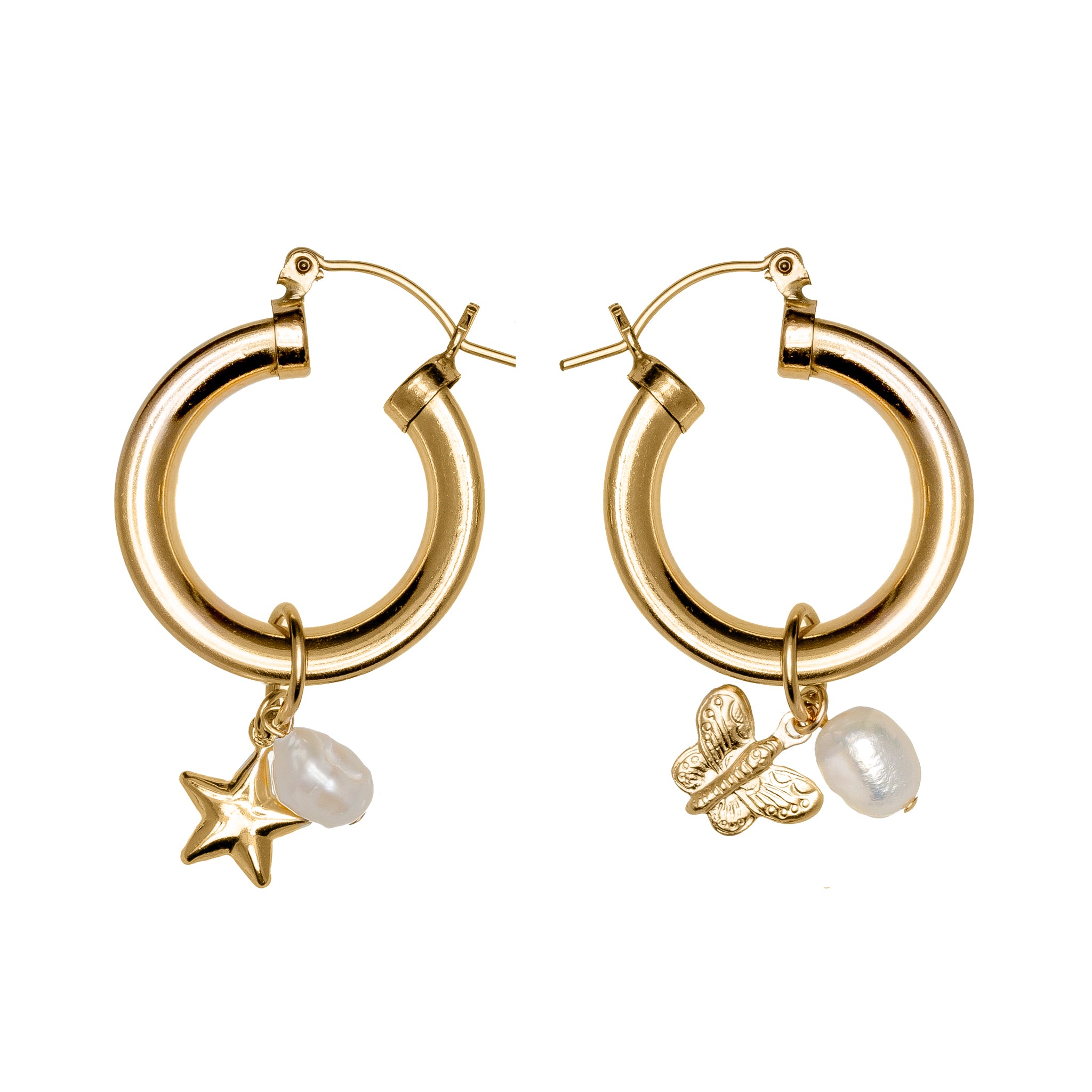 A playful mismatched pair of hoops that elevate any outfit. Stars to remind you to shine bright and butterflies that represent transformation and metamorphosis.